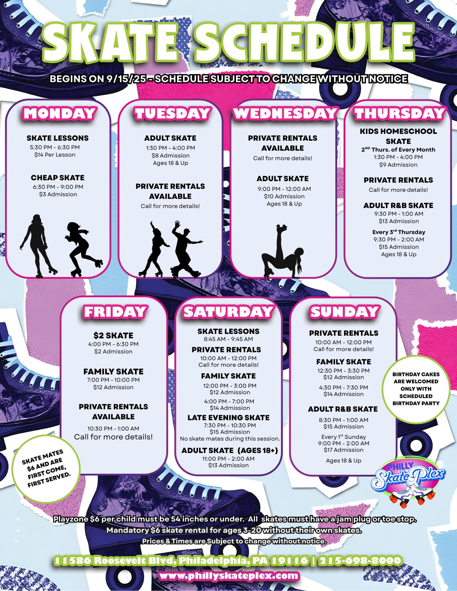 PLEASE CHECK OUR DAILY SKATE CALENDAR FOR TIMES AND DATES.
