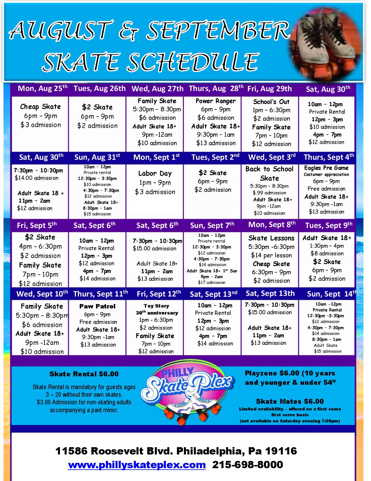 Schedules and pricing may vary during special events. A $6 skate rental is required for all guests ages 3–20 who do not have their own skates. A $3 non-skating adult admission applies to guests age 21 and over who are accompanying a paying minor. Playzone access is $6.