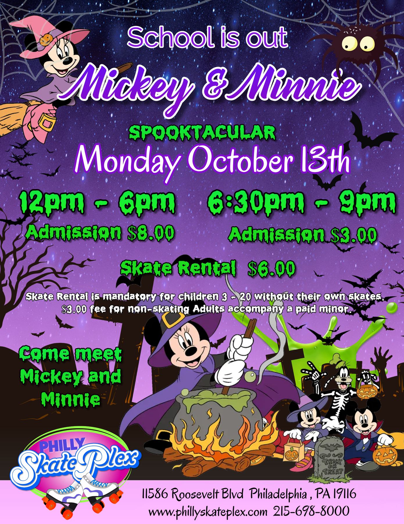 🎉 School’s Out and the fun is on! 🎃✨ Join us Monday, October 13th for our Mickey and Minnie Spooktacular at Philly SkatePlex! 🐭👩‍🎤 From 12:00 p.m. to 6:00 p.m....