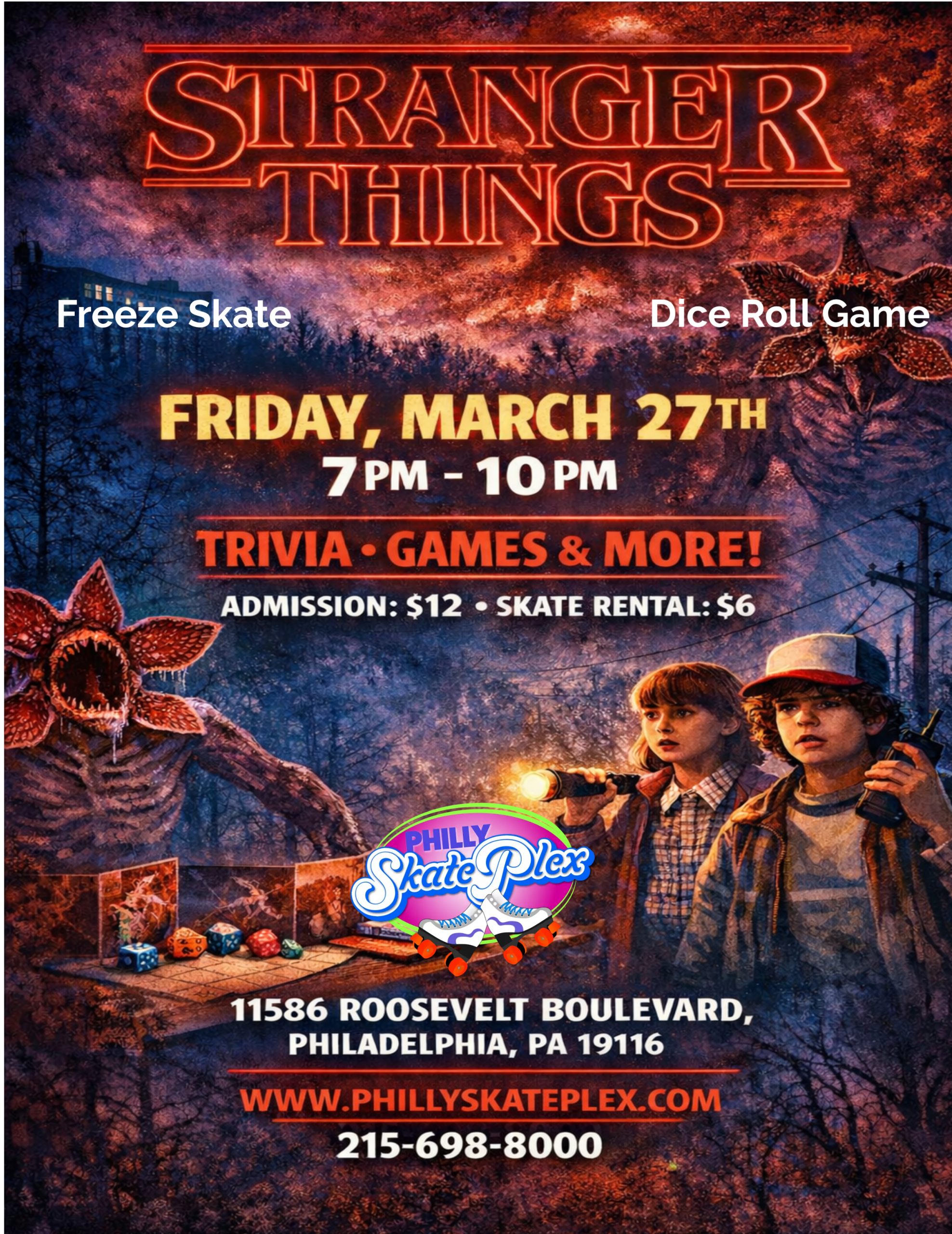Step into the Upside Down at our Stranger Things Skate Night! 🛼✨ Join us Friday, March 27th from 7 PM – 10 PM for a night of skating, Stranger Things...