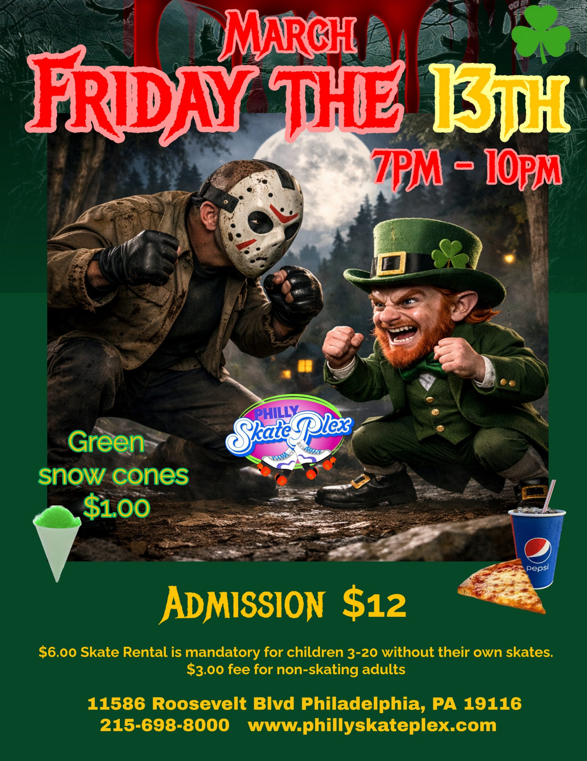 Join us on Friday, March 13th, from 7 PM to 10 PM for a night full of fun and festive vibes! 🎉 Admission is $12, and skate rental is $6....